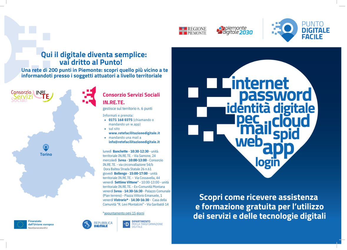 Il servizio è stato attivato grazie alla partecipazione del Consorzio IN.RE.TE., in qualità di soggetto sub-attuatore, al bando della Regione Piemonte: "Bando regionale non competitivo per l'attuazione della Misura 1.7.2. del PNRR: costituzione di reti locali di facilitazione digitale" finanziato dal Ministero per la Transizione Digitale nell'ambito della "MISURA 1.7.2 del PNRR per la Transizione Digitale".