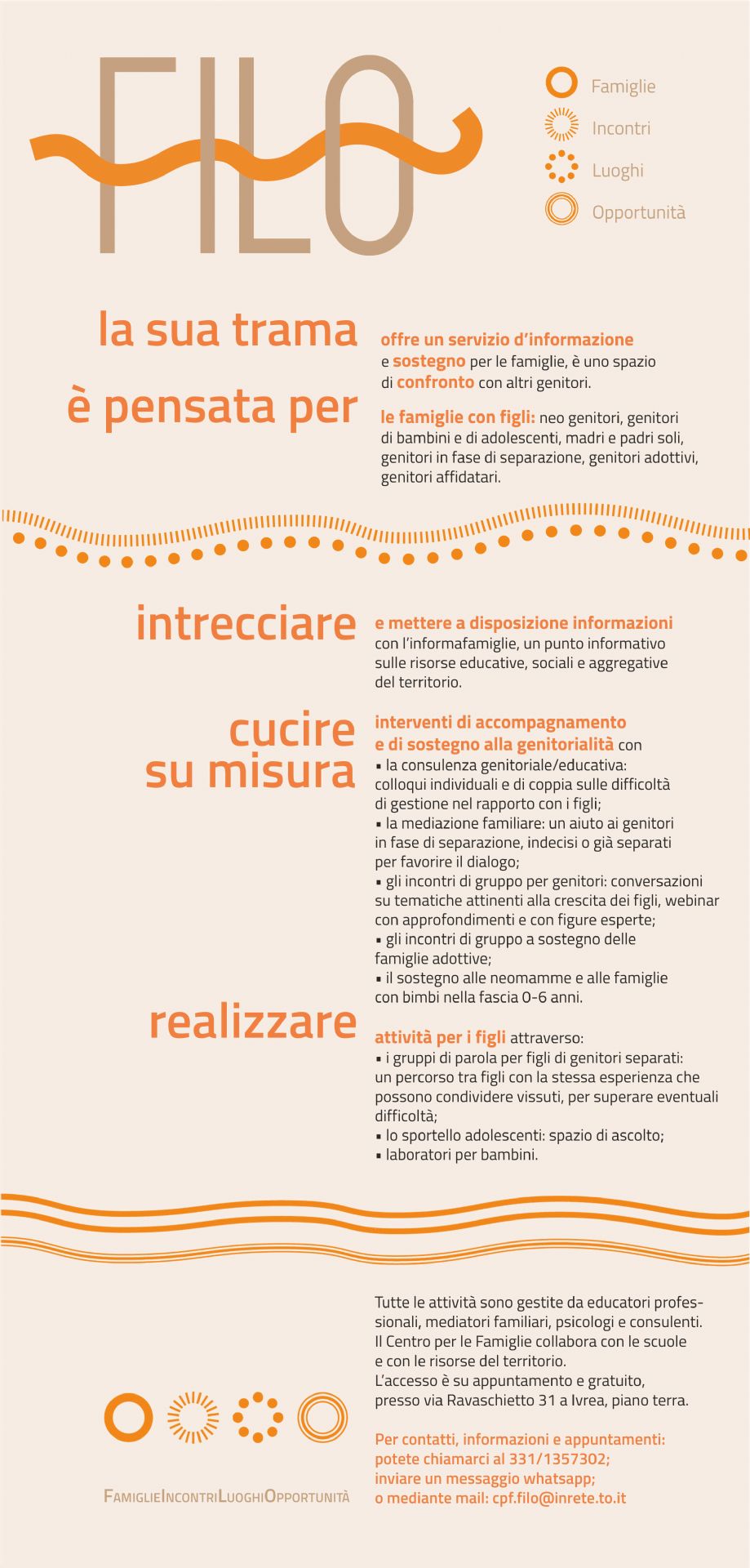 Al Centro per le Famiglie F.I.L.O. di Ivrea continuano gli incontri rivolti a genitori con figli in diverse fasce d'età: 0-6 anni, 6-12 anni; 12-18 anni.