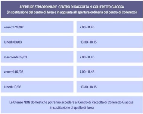 In sostituzione del Centro di Ivrea, gli utenti potranno accedere a Colleretto Giacosa come da tabella allegata.